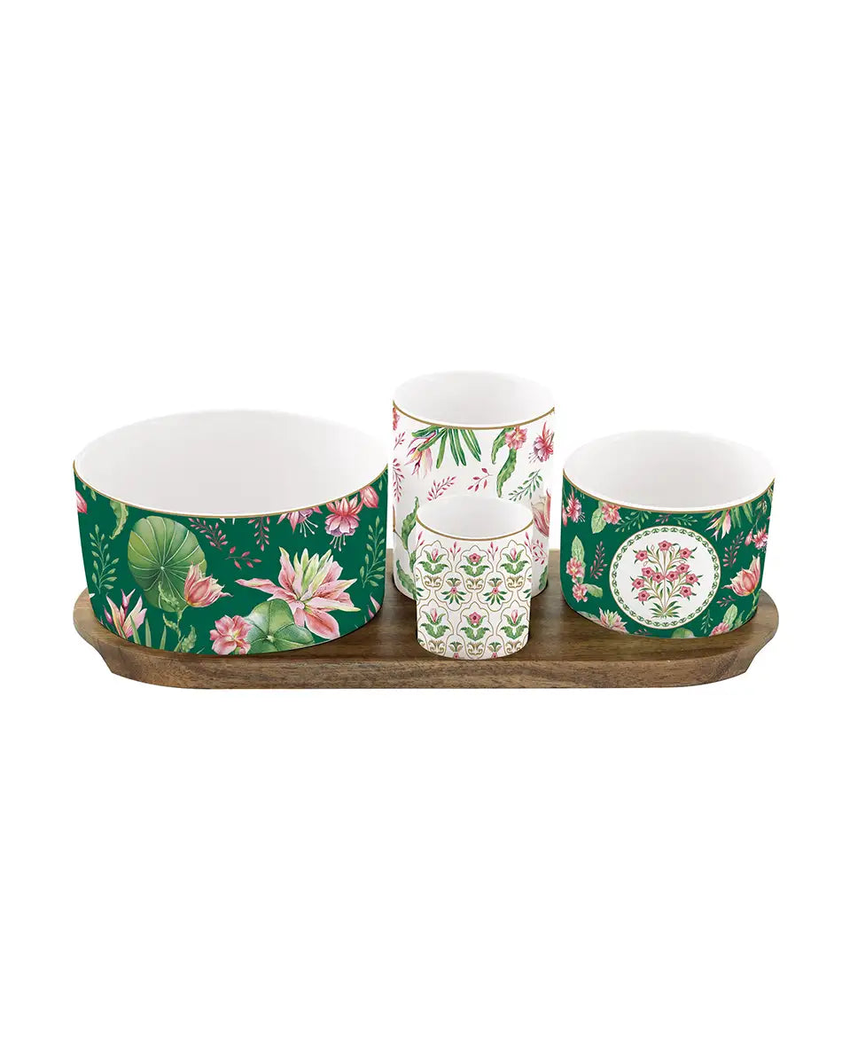 Appetizer Set with Four Round Bowls on Acacia Tray Botanic Chic