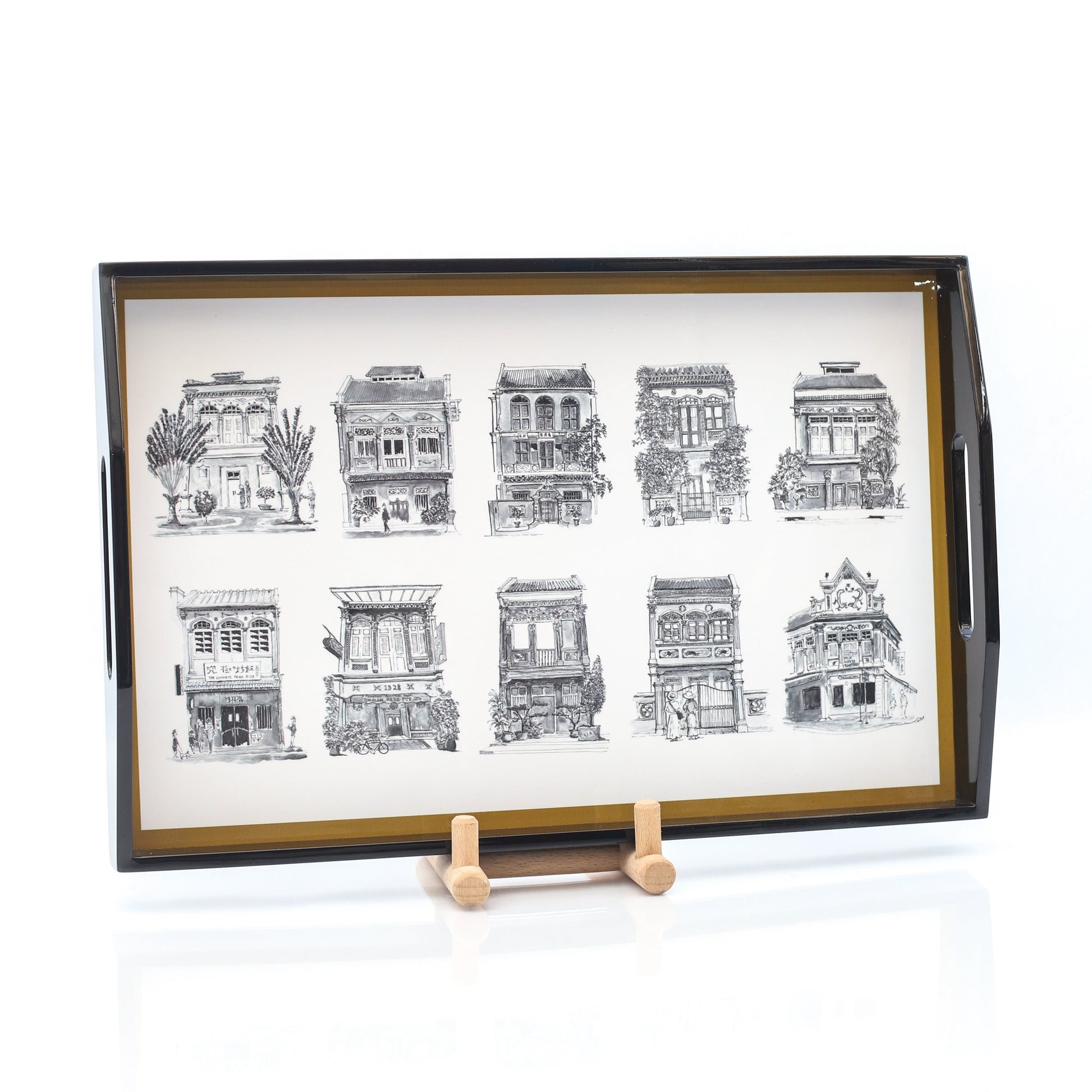 This black lacquer tray manufactured in Vietnam is a show-stopping piece for your home, and it is made to last. It will make a fabulous timeless gift—be it a welcome, leaving or a special occasion gift. The illustrations on the tray consist of the best of 10 black & white houses from our collection. The detailing of our handdrawn shophouses are beautifully captured here.