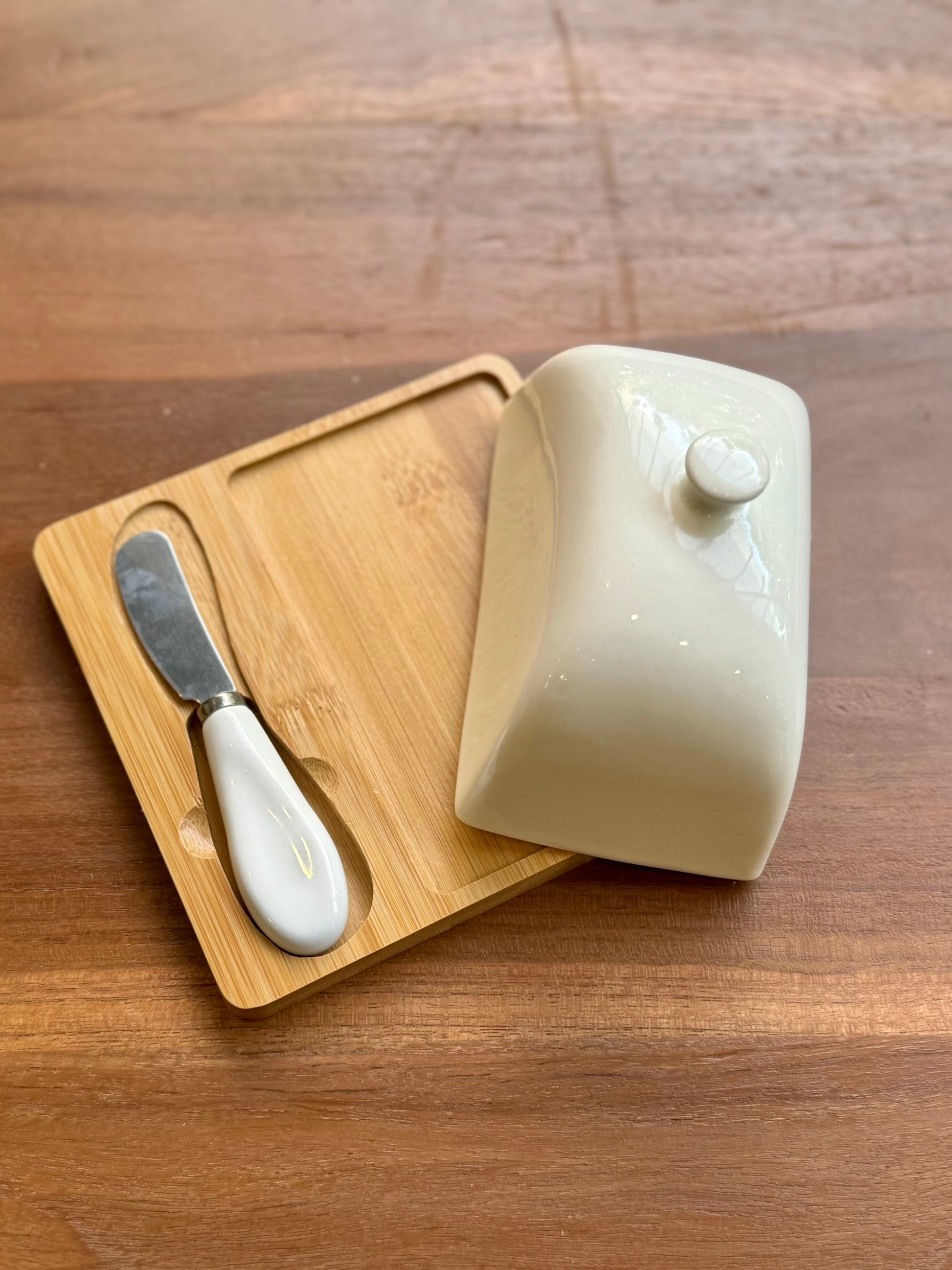 Ceramic and Bamboo Butter Dish w/ Base Plate