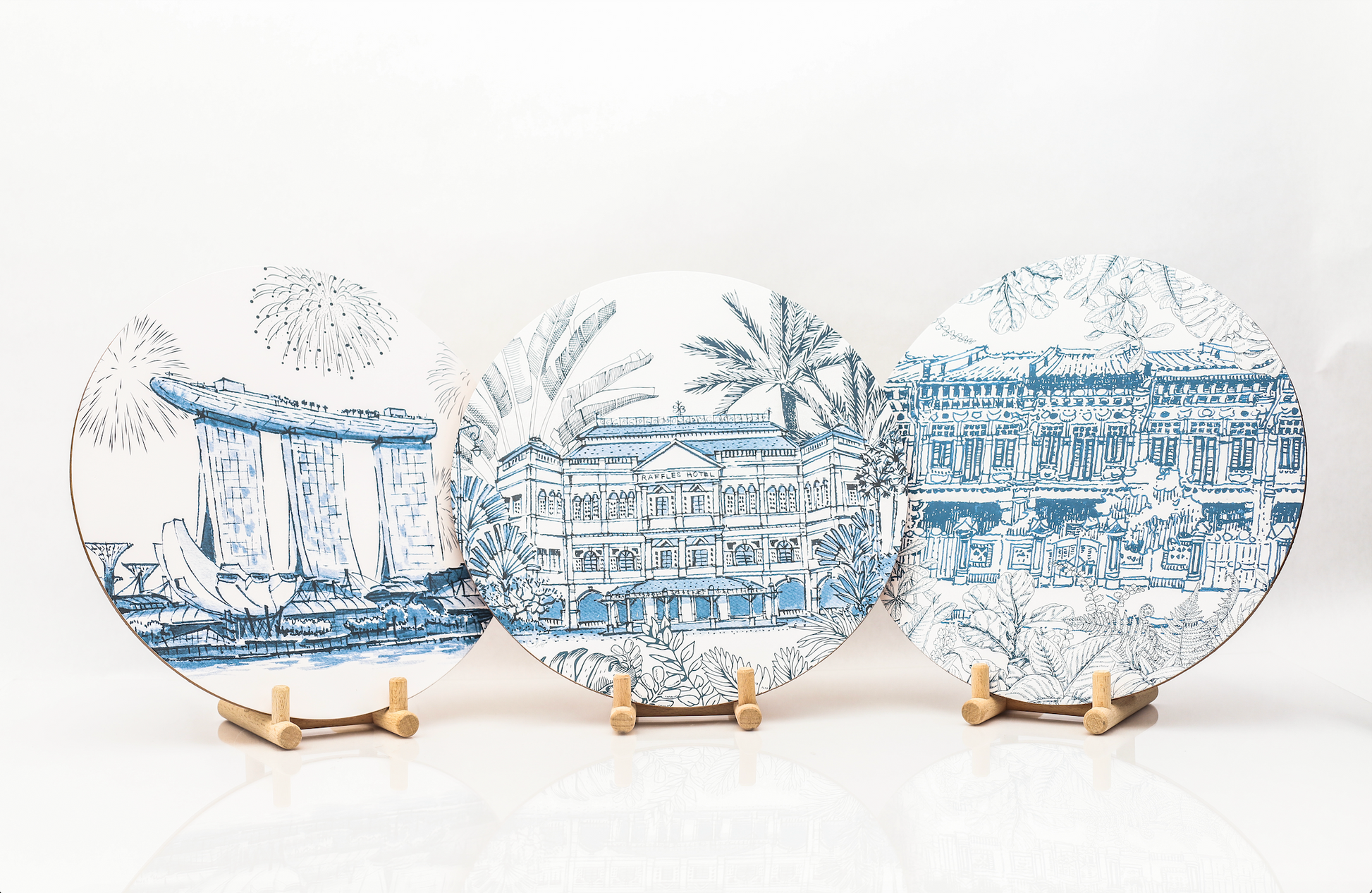 Set of 3 MDF Place Chargers - cork backing to hold hot plates and dishes. Blue and white scenes of Singapore - Raffles, MBS and Koon Seng Shophouses.