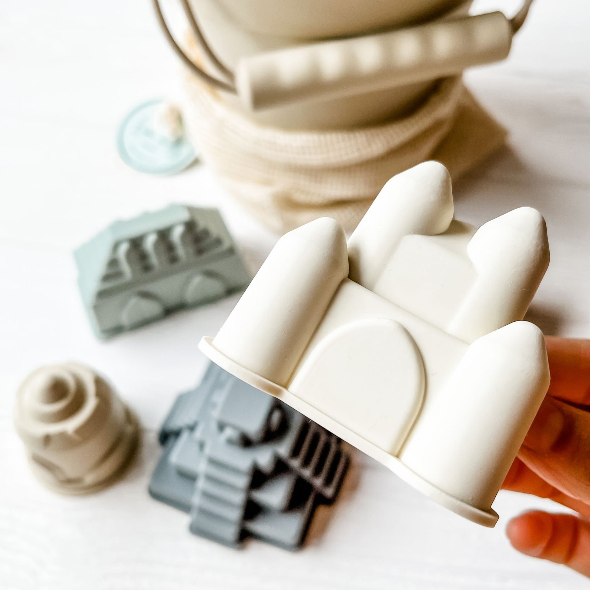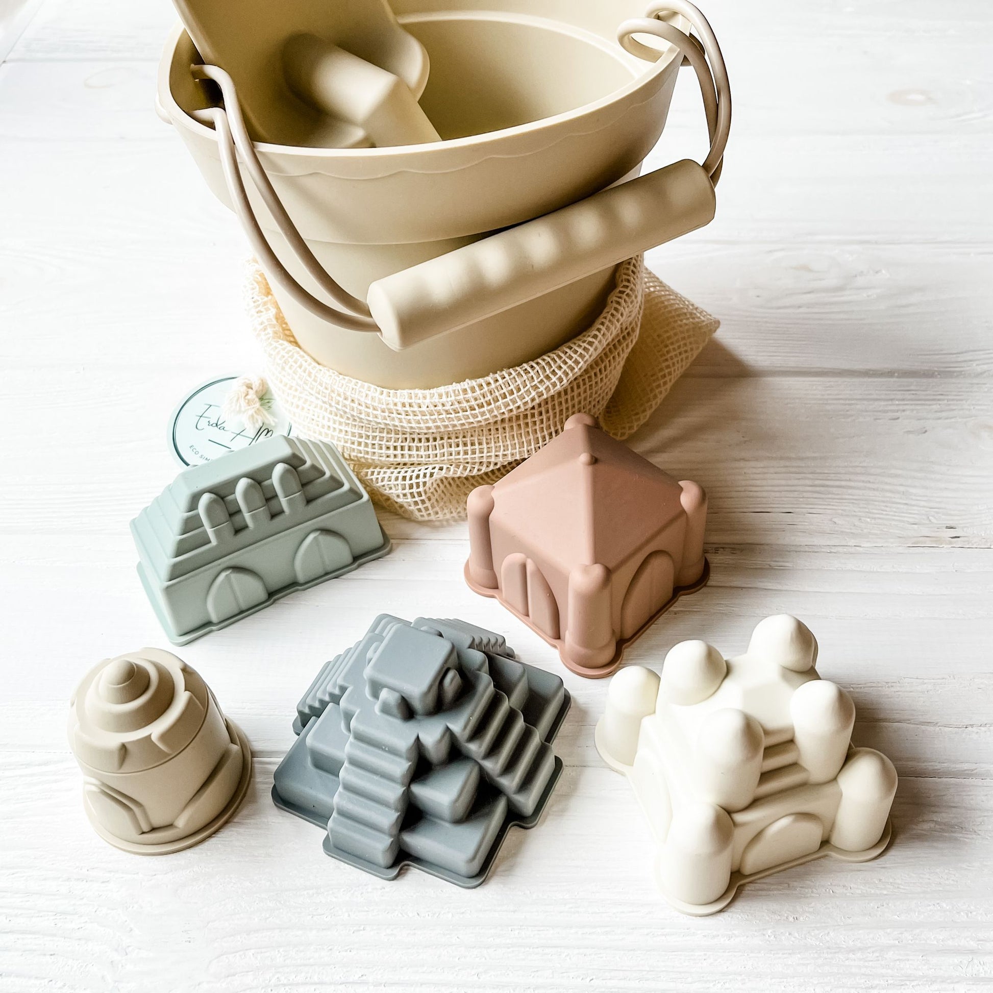 Each set contains a bucket, a spade, and 5 castle moulds. Comes in our re-useable produce bag to avoid packaging.