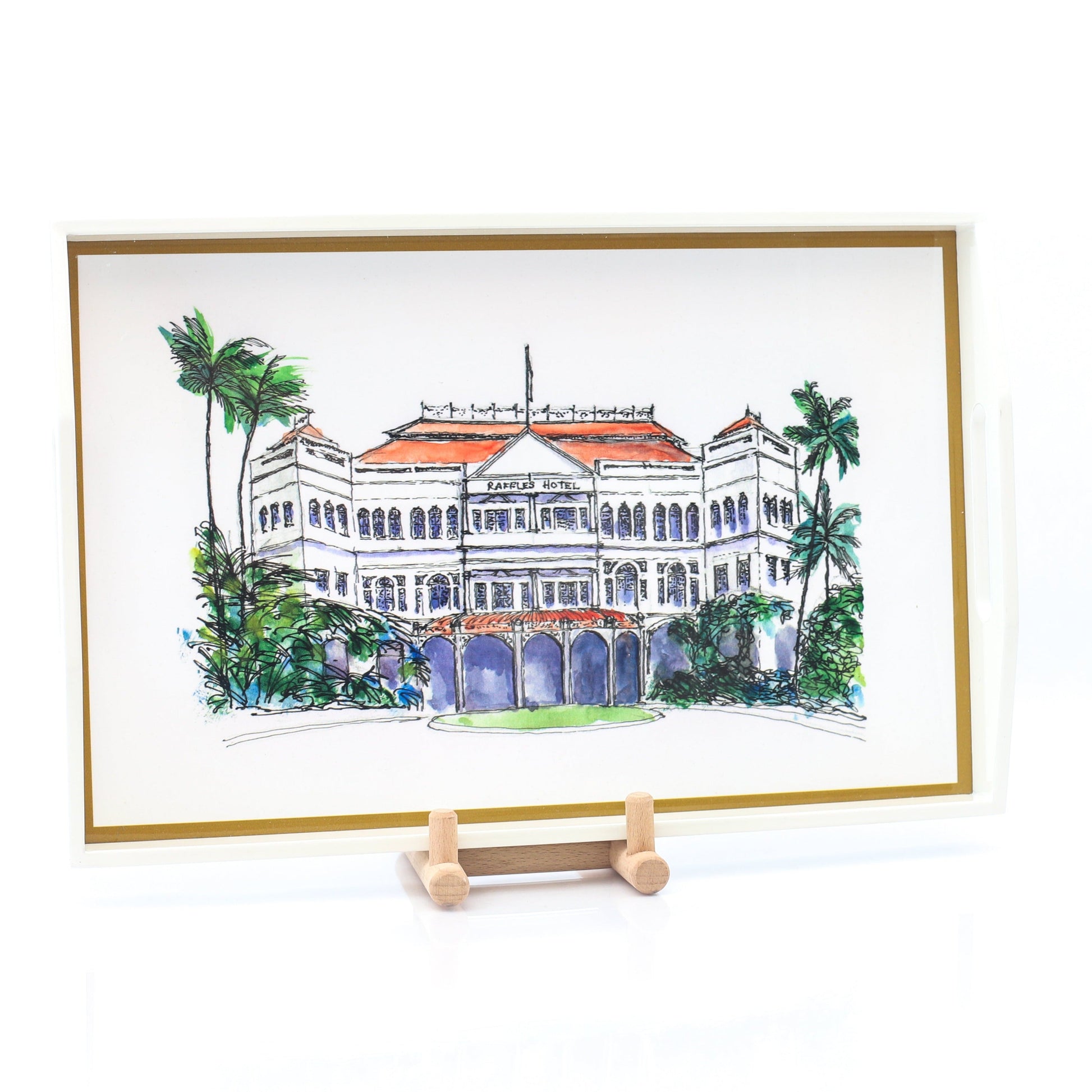 This white lacquer tray manufactured in Vietnam is a show-stopping piece for your home, and it is made to last. It will make a fabulous timeless gift—be it a welcome, leaving, or special occasion gift. The illustration on the tray is that of the world famous Raffles Hotel. The detailing of this beautiful building is beautifully captured here.