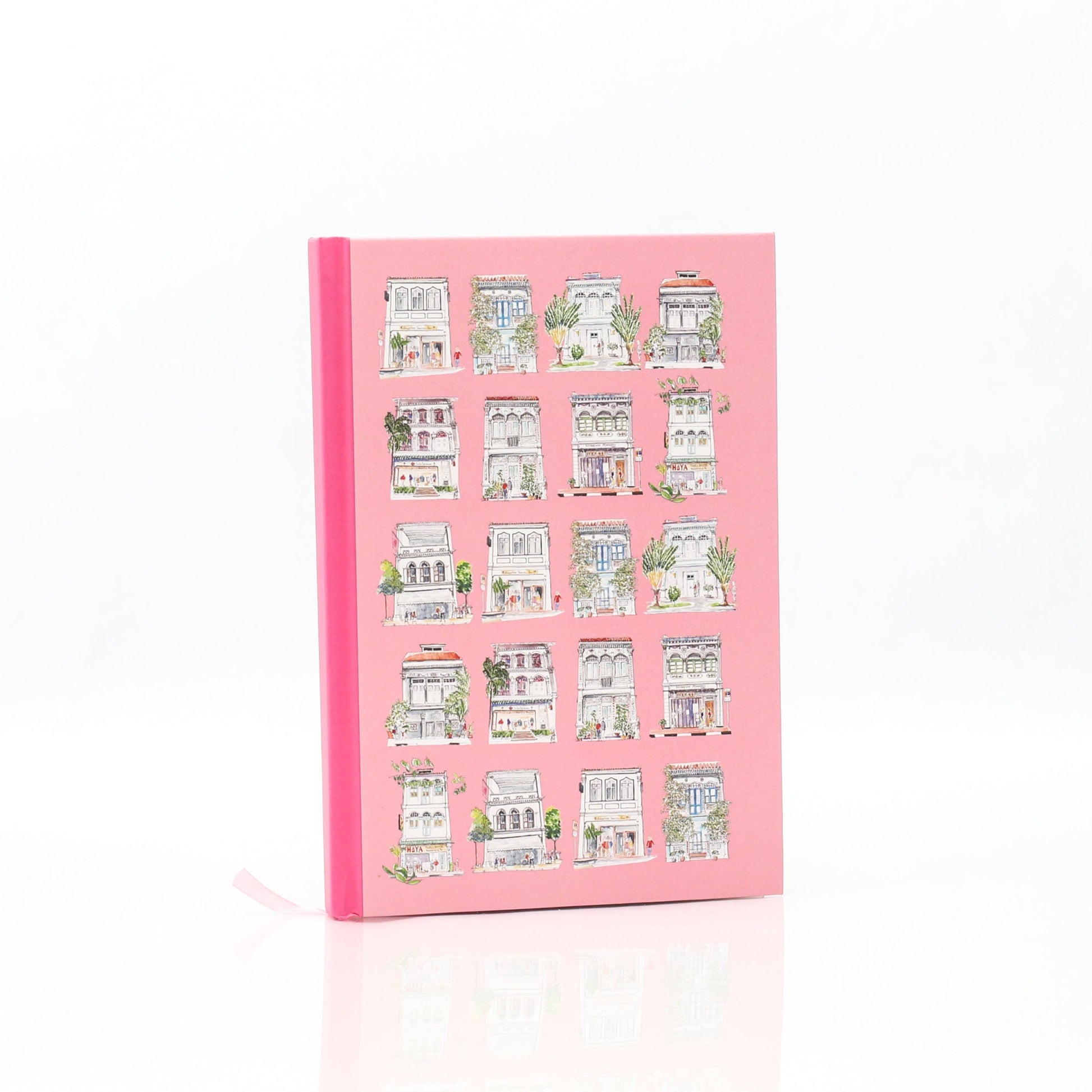 A beautifully decorated pink hard cover A5 notebook from Gingerlily - featuring illustrations of the colourful shophouses of Singapore. Blank pages inside.