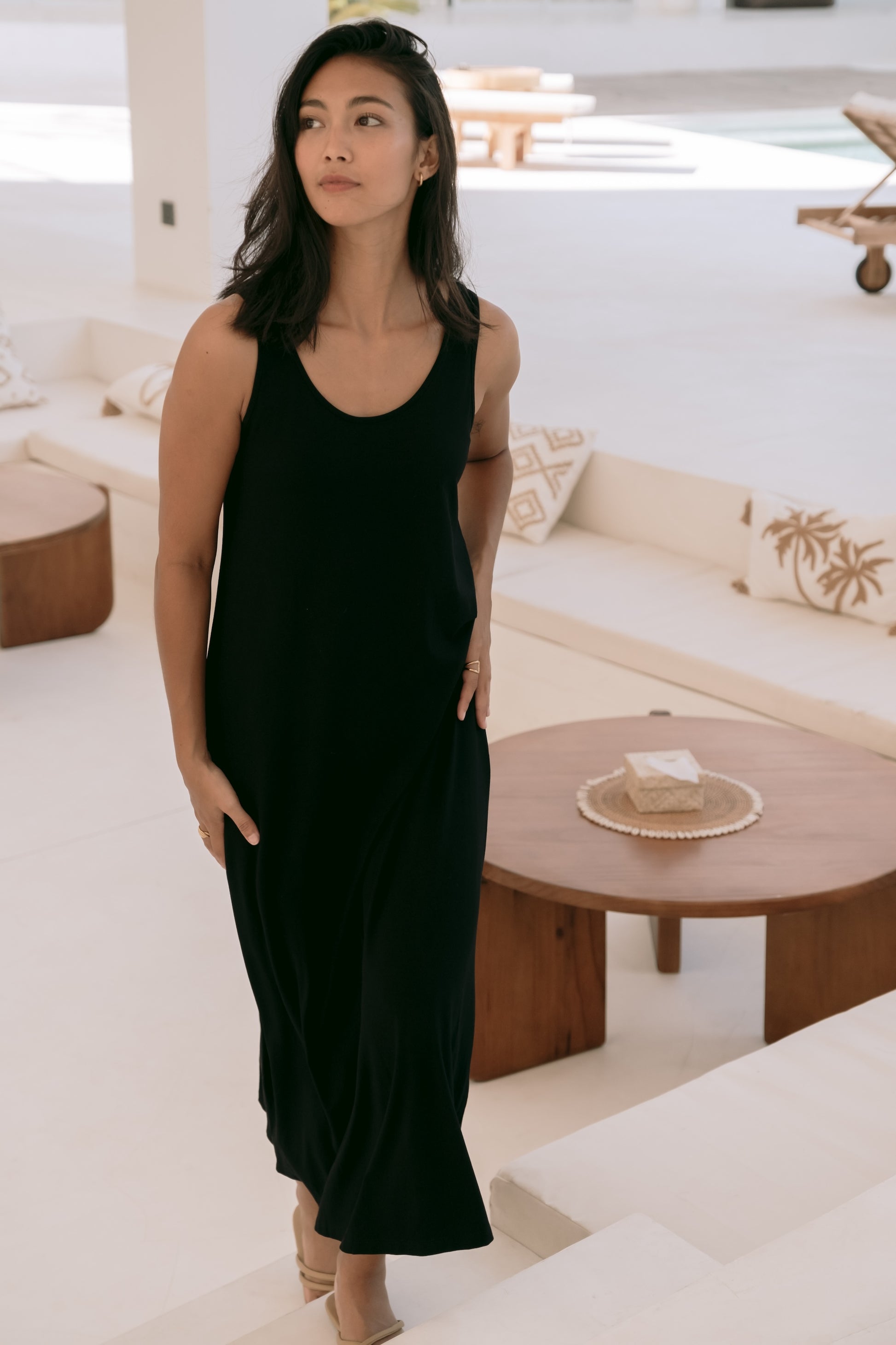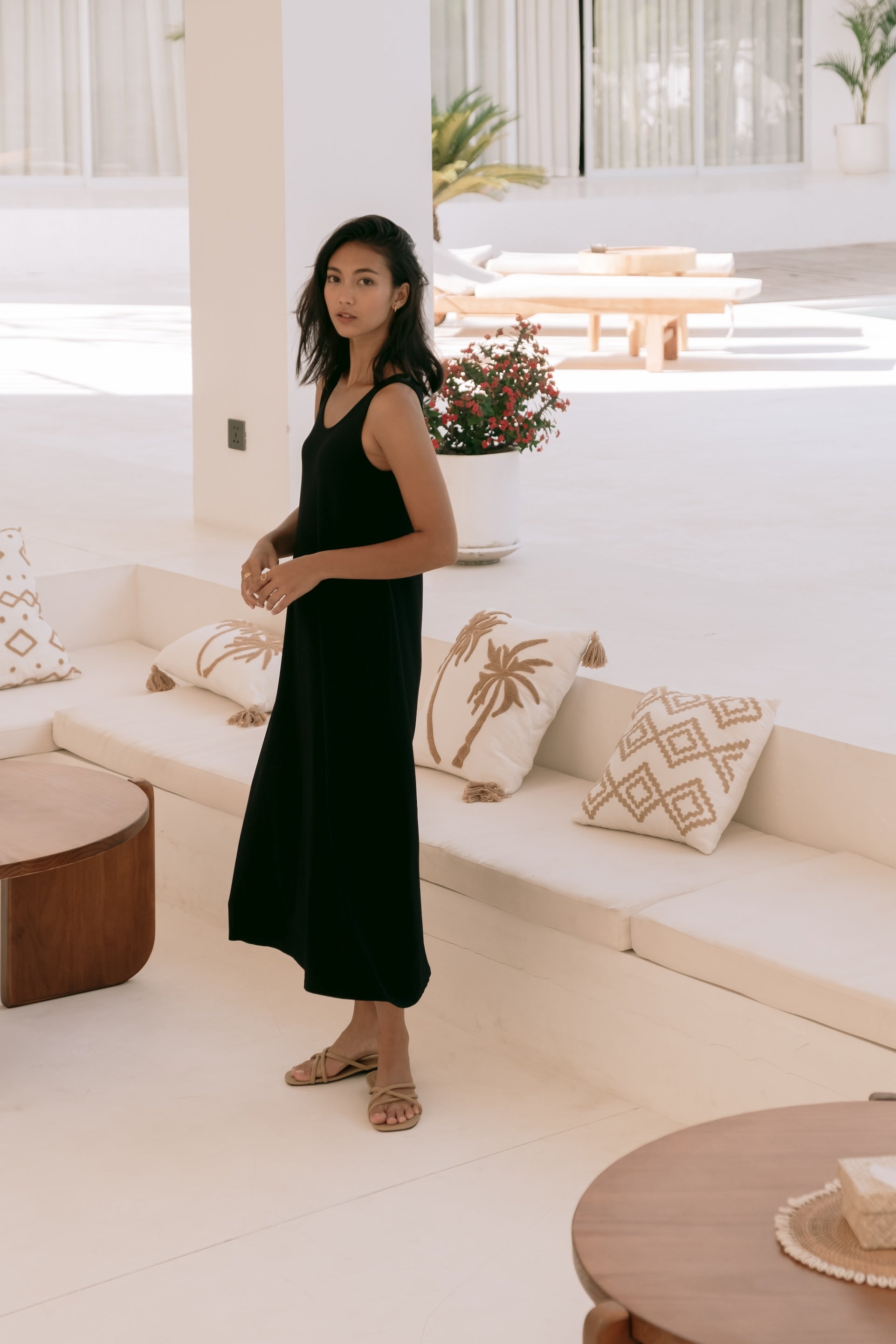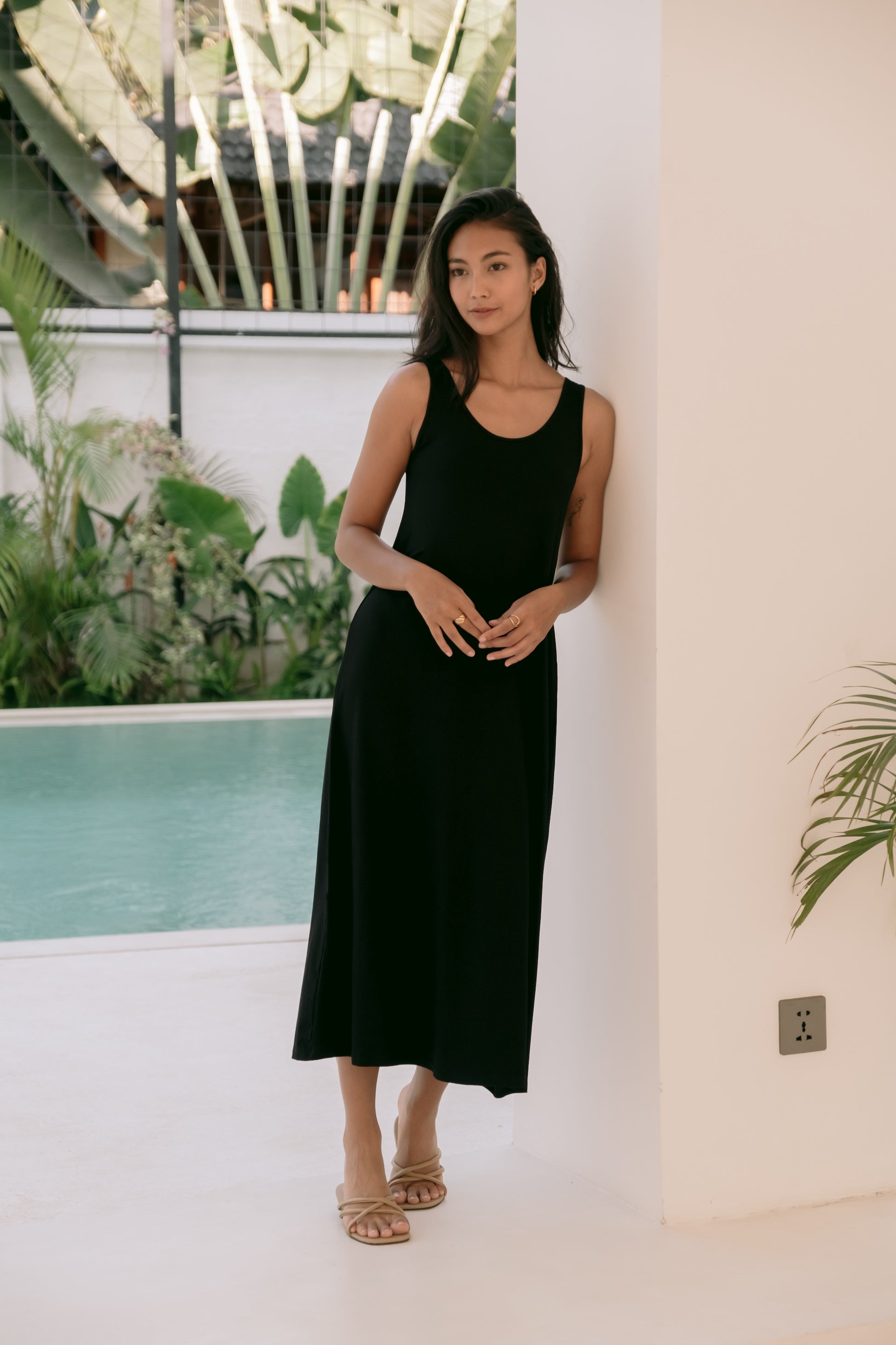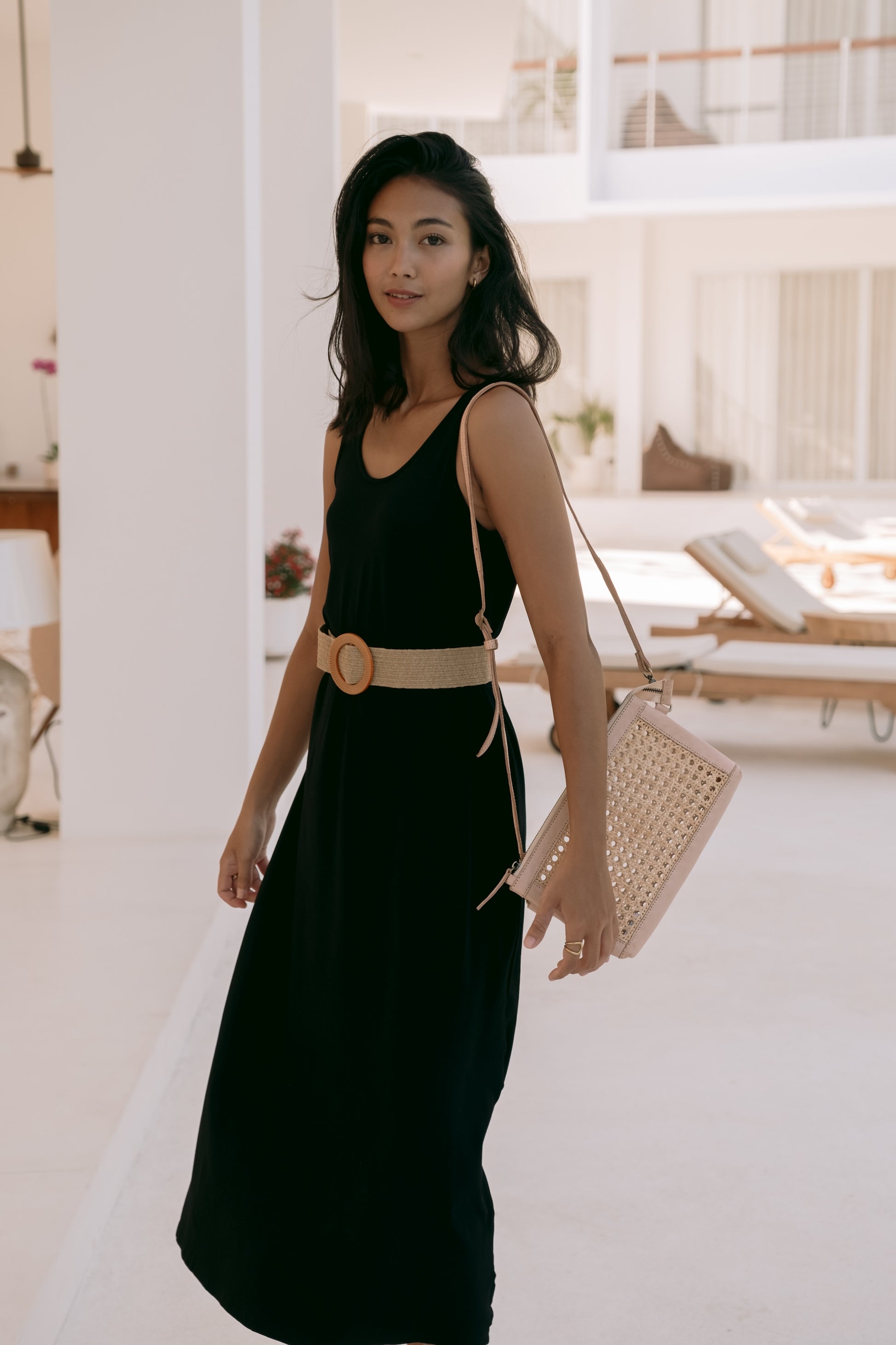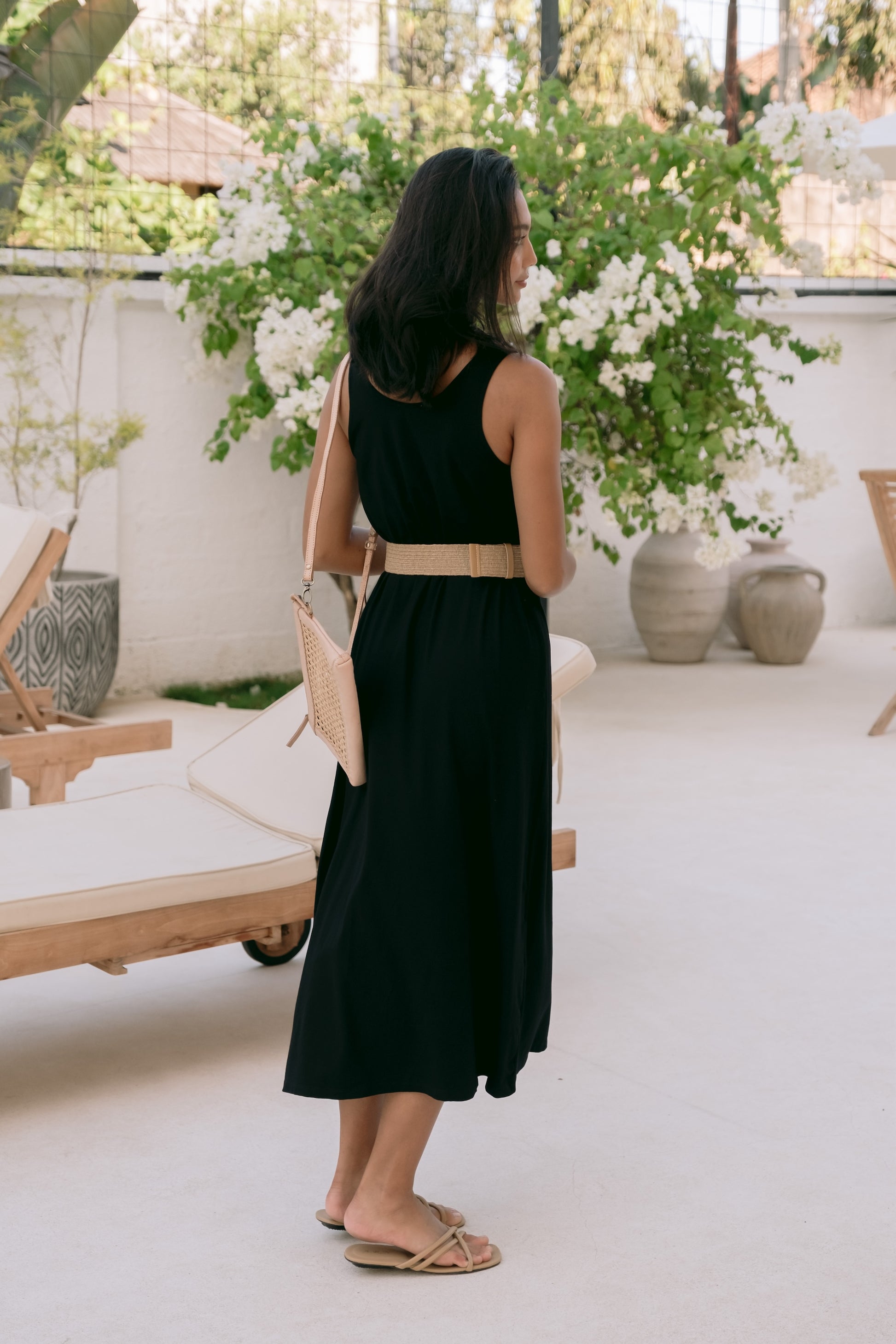 This sleeveless maxi dress, made from a soft bamboo-cotton blend, features a classic round neckline and a flowing silhouette that exudes timeless elegance. Perfect for warm days or casual evenings, it offers eco-friendly comfort without compromising on style. It looks great worn alone, or paired with a lovely rattan belt from our belt collection.