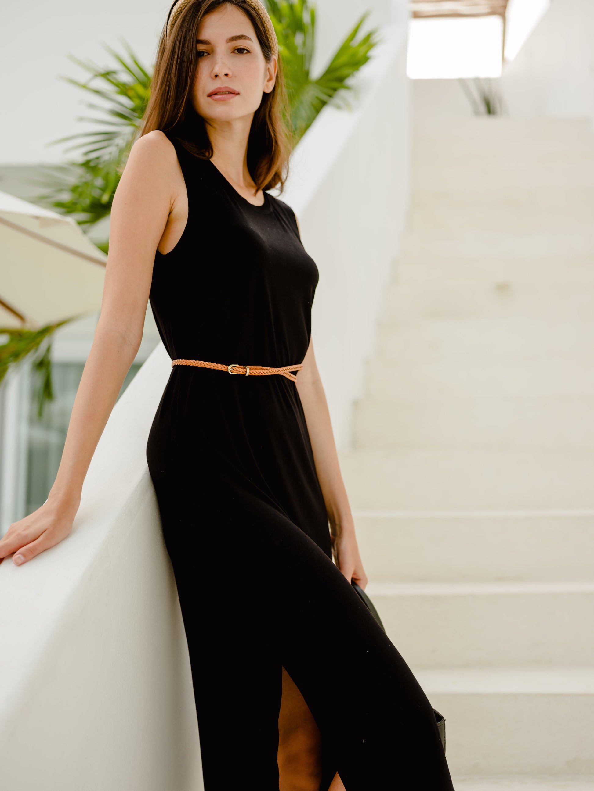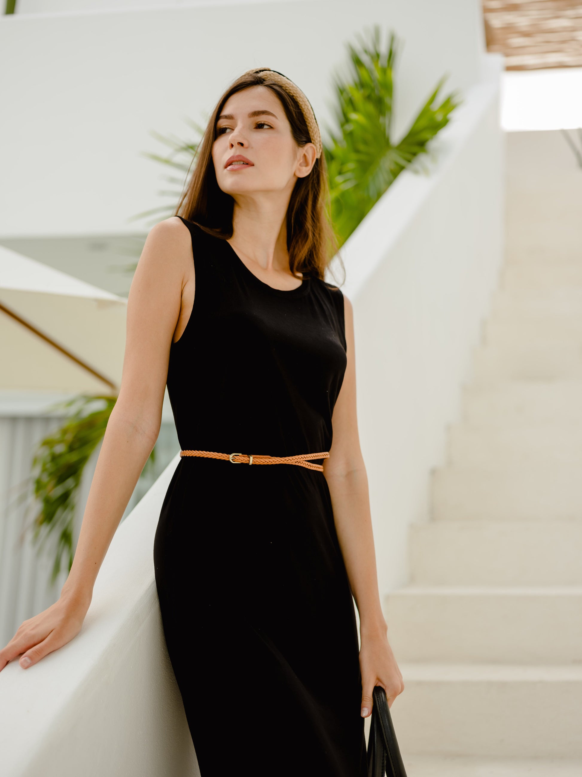 model is wearing black XS, paired with a rattan hairband and skinny braided belt.