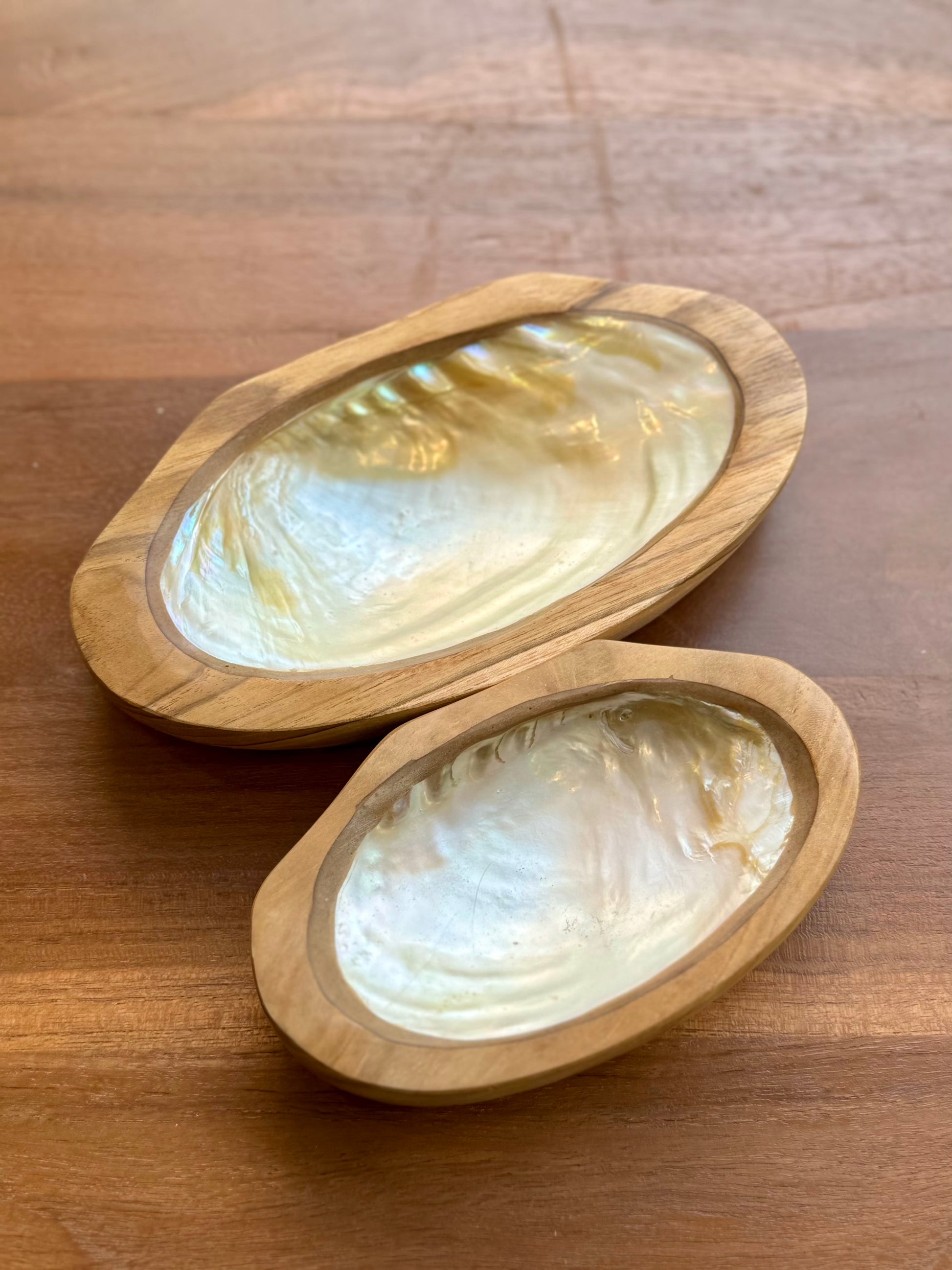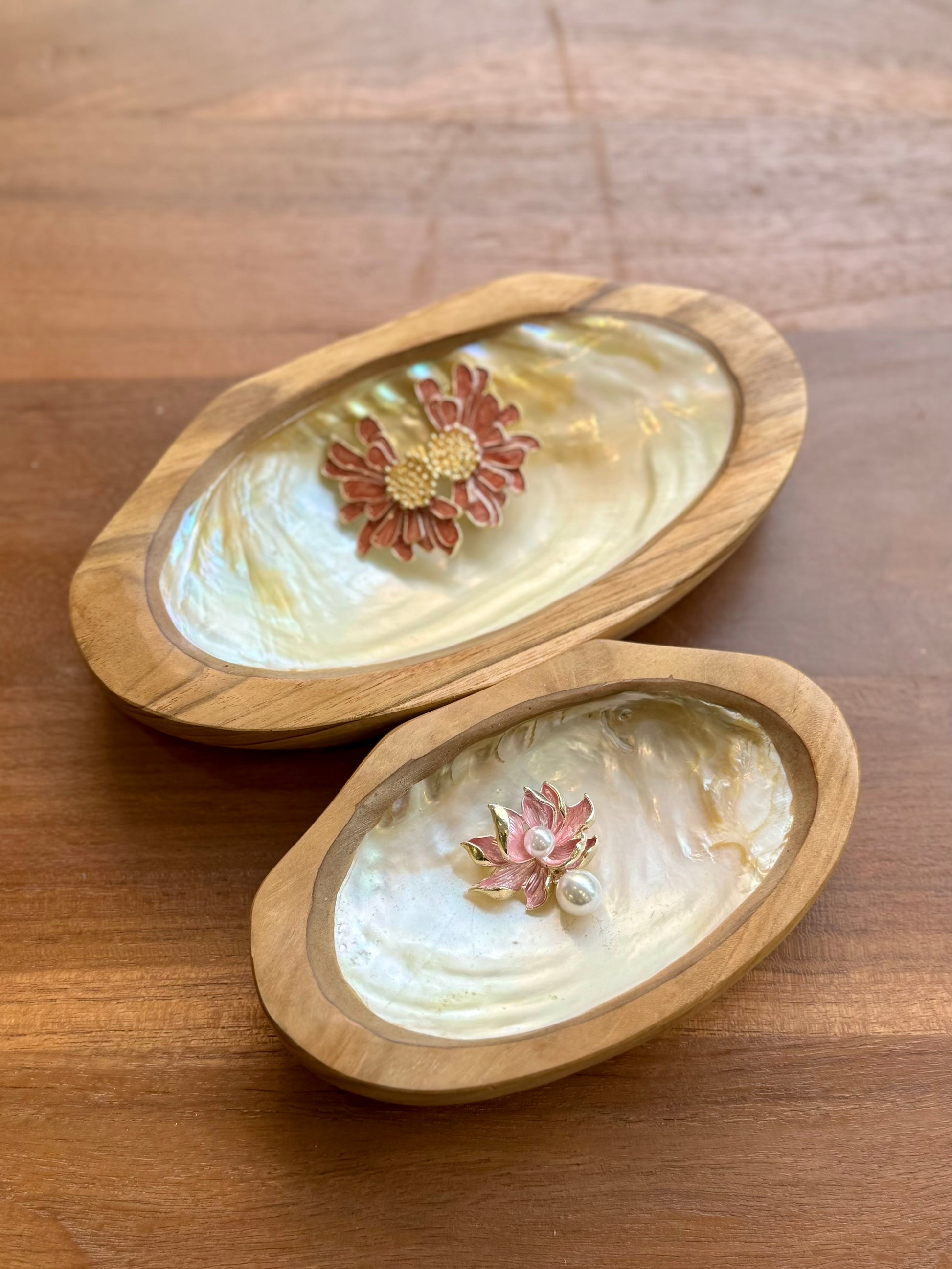 - Handcrafted with teak and pearl