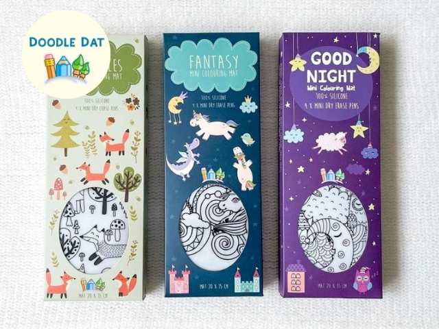 Each pack comes in its own colourful box containing a silicone coloring mat (measures 20 x 15cm) & 4 pens (red, blue, green & yellow).