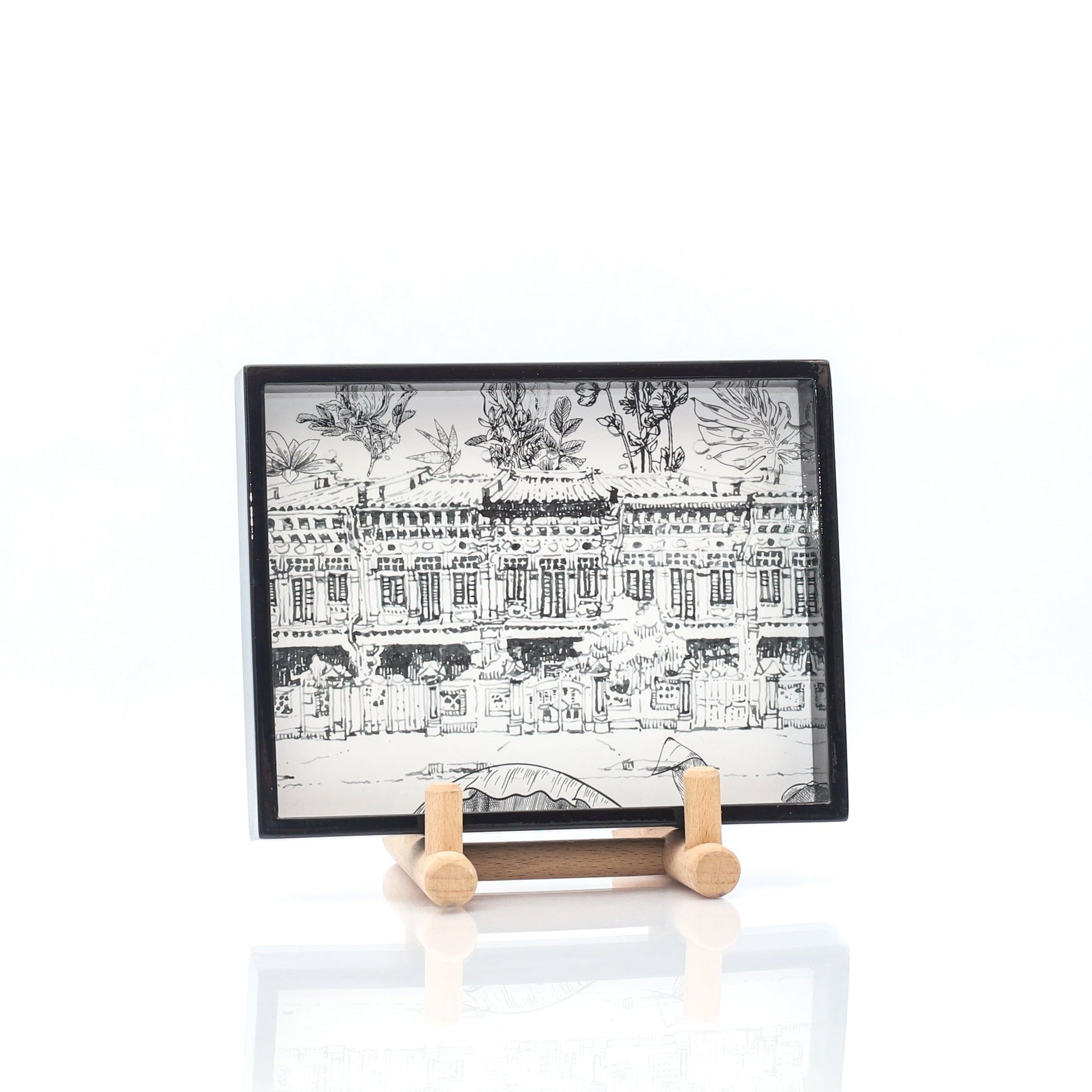 This black lacquer trinket tray is manufactured in Vietnam. It will make a fabulous timeless gift or for personal usage—handy at the entrance of the house to leave your keys and nicknacks. The illustrations on the tray is Koon Seng shophouses from our collection. The detailing of our hand drawn shophouses are beautifully captured here.