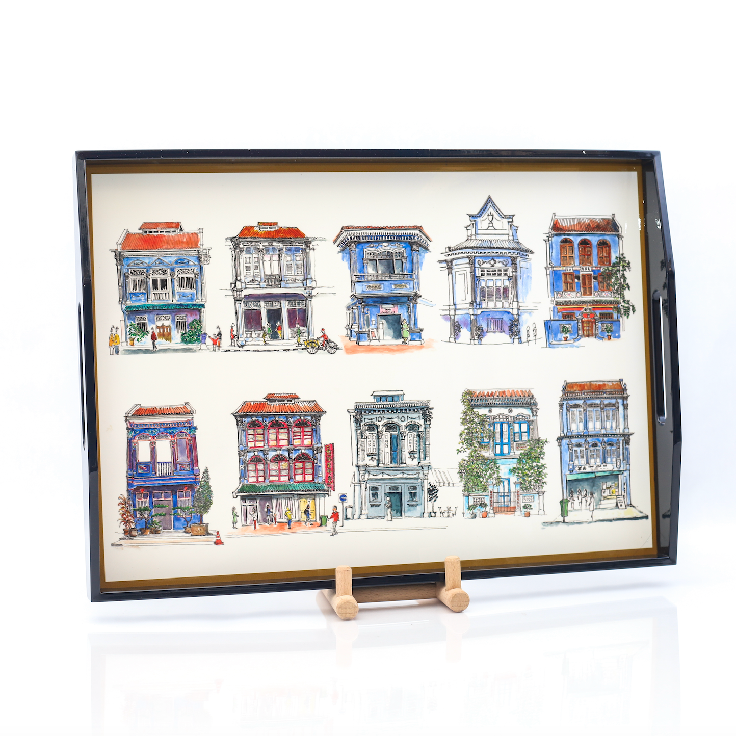 This navy lacquer tray manufactured in Vietnam is a show-stopping piece for your home, and it is made to last. It will make a fabulous timeless gift—be it a welcome, leaving, or special occasion gift. The illustrations on the tray consist of the best of 8 blue shophouses from our collection. The detailing of our hand drawn shophouses are beautifully captured here.