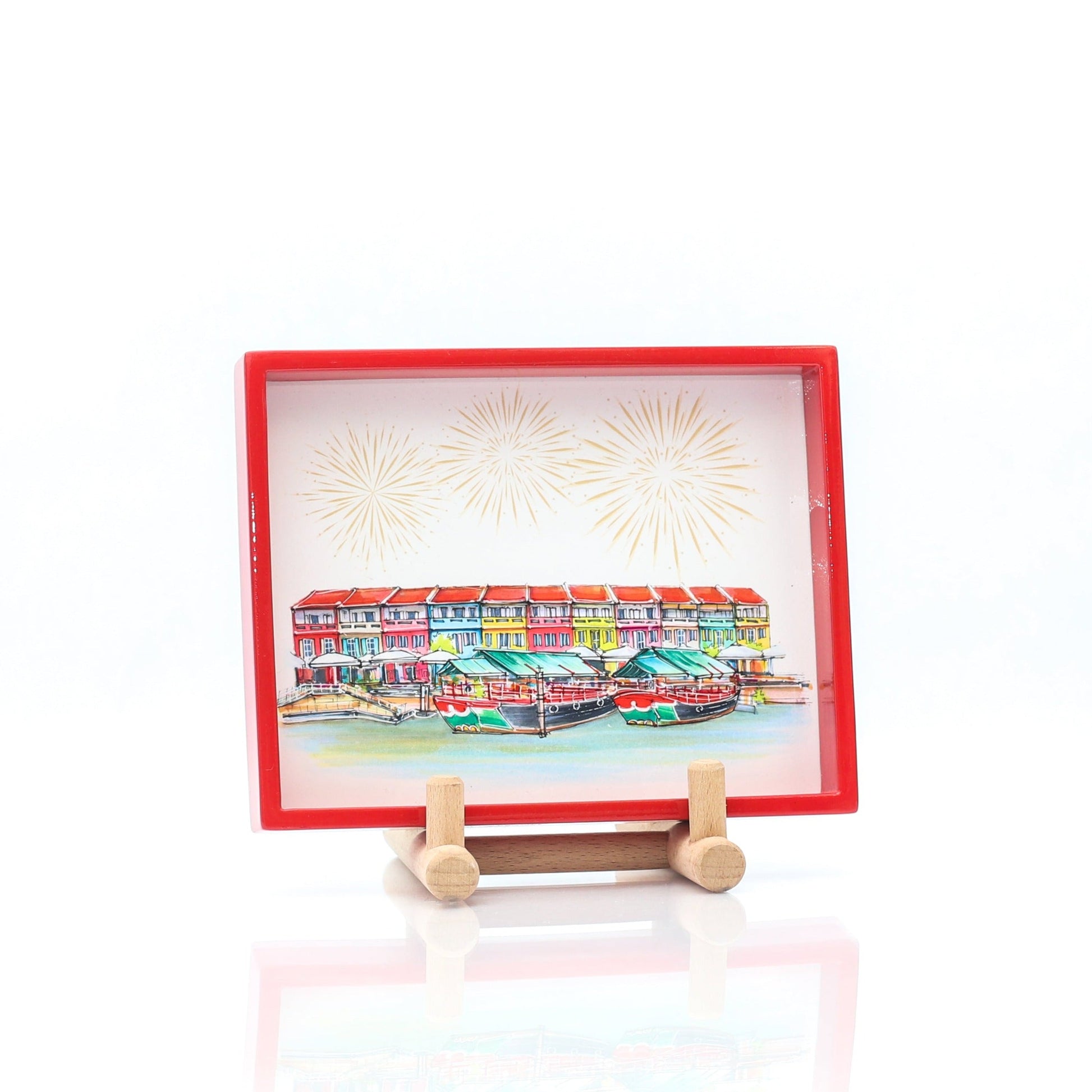 This red lacquer trinket tray is manufactured in Vietnam. It will make a fabulous timeless gift or for personal usage—handy at the entrance of the house to leave your keys and nicknacks. The illustration on the tray is that of Clark Quay from our collection. The detailing of our hand drawn shophouses are beautifully captured here.