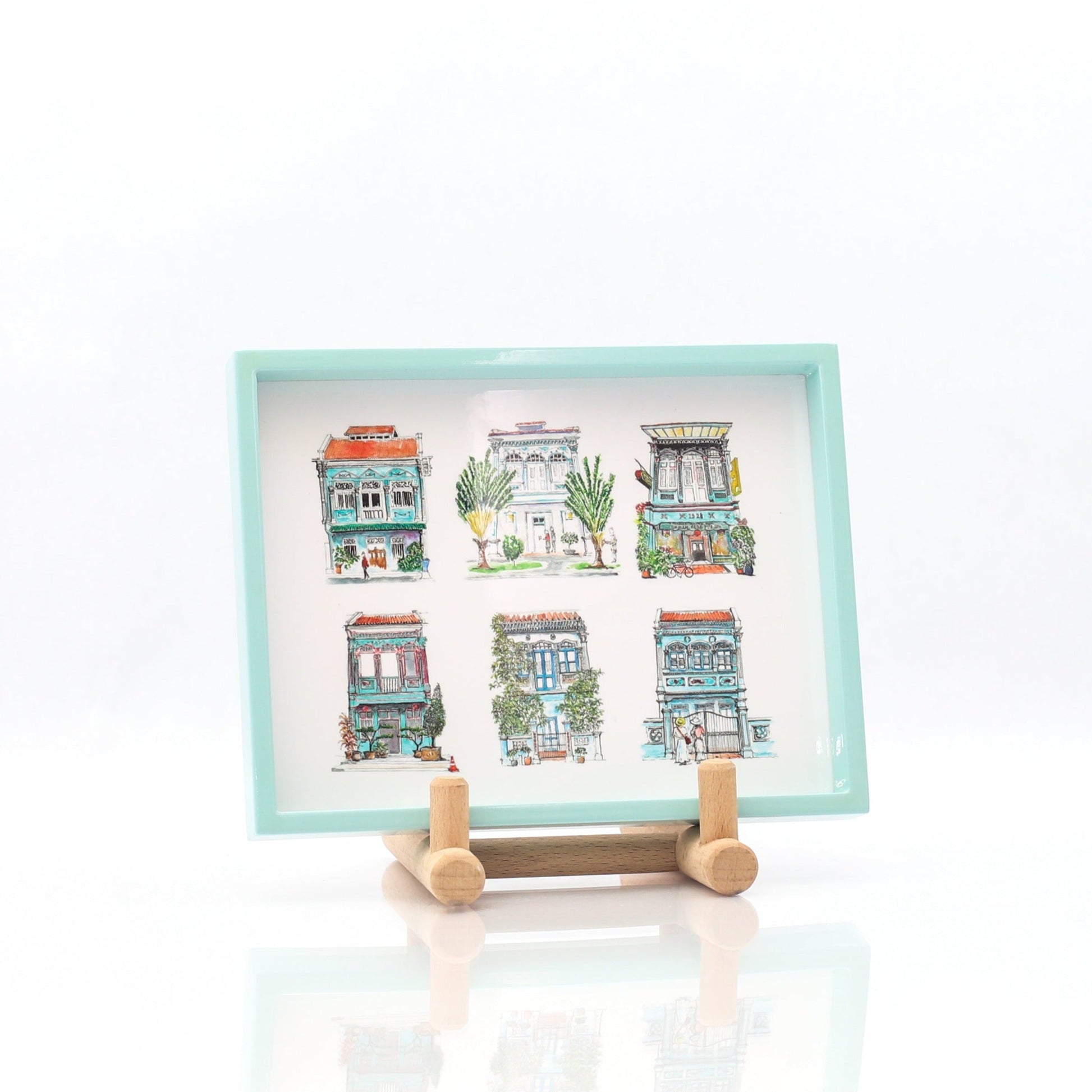 This turquoise lacquer trinket tray is manufactured in Vietnam. It will make a fabulous timeless gift or for personal usage—handy at the entrance of the house to leave your keys and nicknacks. The illustrations on the tray consist of the best of 6 turquoise shophouses from our collection. The detailing of our hand drawn shophouses are beautifully captured here.