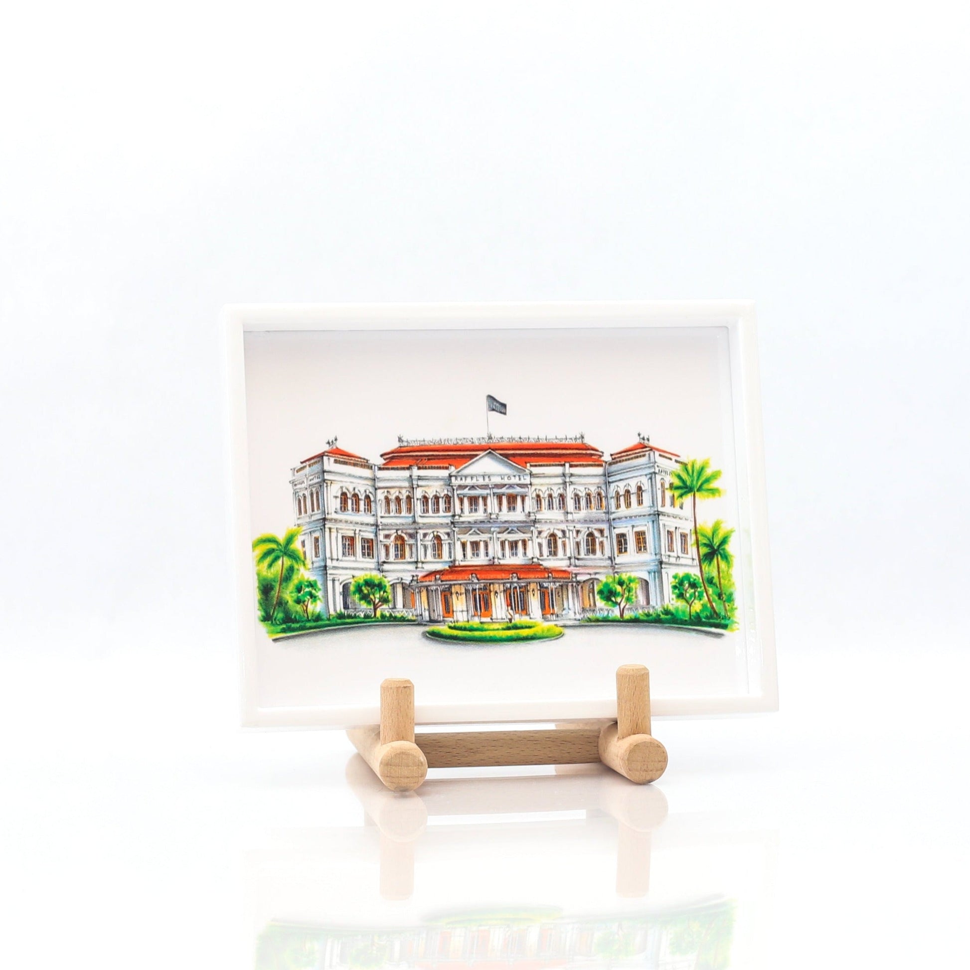 This white lacquer trinket tray is manufactured in Vietnam. It will make a fabulous timeless gift or for personal usage—handy at the entrance of the house to leave your keys and nicknacks. The illustration on the is that of Raffles Hotel from our collection. The detailing of our hand drawn shophouses are beautifully captured here.