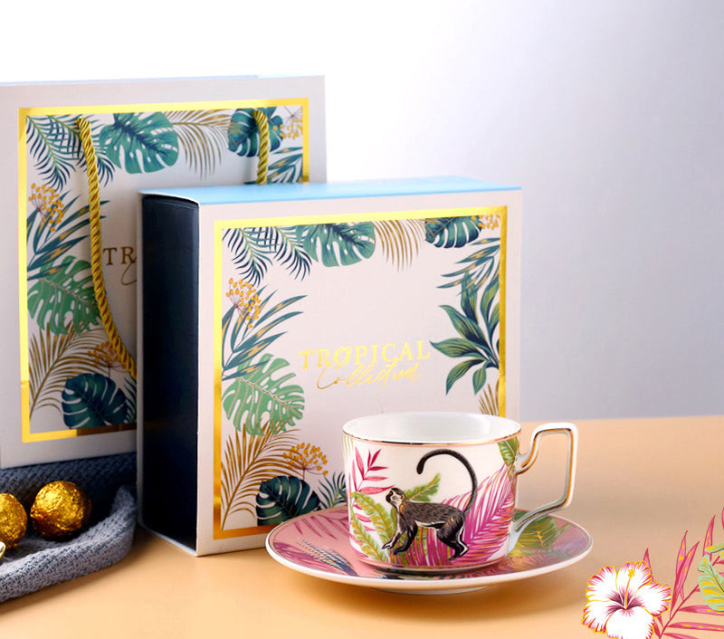 Striking jungle series plate with gold edges. Comes in 6 different animal teacup / coffee cup and saucer set - Both the teacup and saucer comes adorned with animals and vibrant colours!